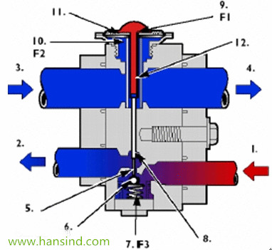 圖中:1、自過(guò)濾干燥器 2、到蒸發(fā)器 3、自蒸發(fā)器 4、到壓縮機(jī) 5、測(cè)量孔 6、球 、7彈簧 8、活動(dòng)腳 9、制冷劑 10、薄膜下壓力補(bǔ)償 11、金屬薄膜 12、感溫元件