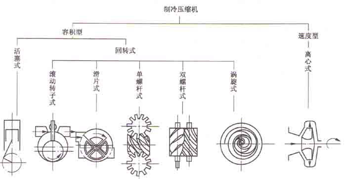 制冷壓縮機(jī)的種類有:轉(zhuǎn)子式壓縮機(jī),離心式壓縮機(jī),活塞式壓縮機(jī)、渦旋式壓縮機(jī)、螺桿式壓縮機(jī)等。