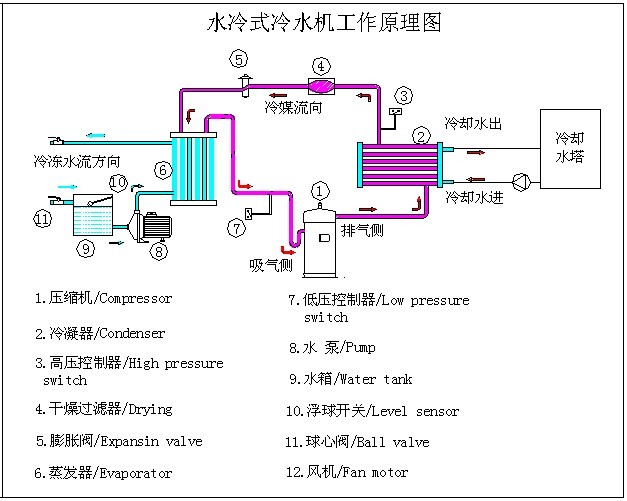 5、如冷水機組系統(tǒng)1冷媒(制冷劑,雪種)泄漏,制冷系統(tǒng)中某處,如毛細管,膨脹閥,干燥過濾大,等處有堵塞現象,造成制冷系統(tǒng)1低壓壓力過低,系統(tǒng)1低壓保護開關動作,正常時是常閉開關,動作后成為常開。